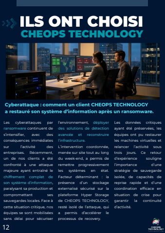 Les cyberattaques parransomware continuent des%u2019intensifier, avec descons%u00e9quences imm%u00e9diatessur l%u2019activit%u00e9 desentreprises. R%u00e9cemment,un de nos clients a %u00e9t%u00e9confront%u00e9 %u00e0 une attaquemajeure ayant entra%u00een%u00e9 lechiffrement complet deson syst%u00e8me d%u2019information,paralysant sa production etcompromettant sessauvegardes locales. Face %u00e0cette situation critique, nos%u00e9quipes se sont mobilis%u00e9essans d%u00e9lai pour s%u00e9curiserl%u2019environnement, les pou12Cyberattaque : comment un client CHEOPS TECHNOLOGYa restaur%u00e9 son syst%u00e8me d%u2019information apr%u00e8s un ransomware.ILS ONT CHOISICHEOPS TECHNOLOGYl%u2019environnement, d%u00e9ployerdes solutions de d%u00e9tectionavanc%u00e9e et reconstruirel%u2019infrastructure.L%u2019intervention coordonn%u00e9e,men%u00e9e sur site tout au longdu week-end, a permis deremettre progressivementles syst%u00e8mes en %u00e9tat.Facteur d%u00e9terminant : lapr%u00e9sence d%u2019un stockageexternalis%u00e9 s%u00e9curis%u00e9 sur laplateforme Hyper Storagede CHEOPS TECHNOLOGY,rest%u00e9 isol%u00e9 de l%u2019attaque, quia permis d%u2019acc%u00e9l%u00e9rer leprocessus de recovery. Lesdonn%u00e9es critique rest%u00e9Les donn%u00e9es critiquesayant %u00e9t%u00e9 pr%u00e9serv%u00e9es, les%u00e9quipes ont pu restaurerles machines virtuelles etrelancer l%u2019activit%u00e9 soustrois jours. Ce retourd%u2019exp%u00e9rience soulignel%u2019importance d%u2019unestrat%u00e9gie de sauvegardeisol%u00e9e, de capacit%u00e9s dereprise rapide et d%u2019unecoordination efficace ensituation de crise pourgarantir la continuit%u00e9d%u2019activit%u00e9.