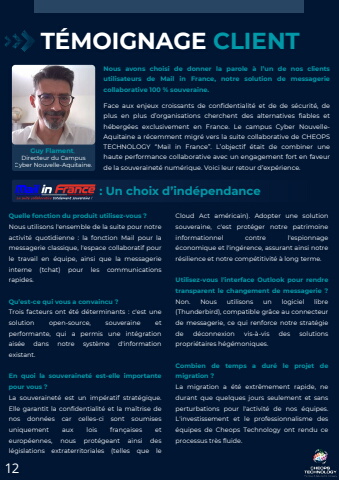 T%u00c9MOIGNAGE CLIENTQuelle fonction du produit utilisez-vous ?Nous utilisons l'ensemble de la suite pour notreactivit%u00e9 quotidienne : la fonction Mail pour lamessagerie classique, l'espace collaboratif pourle travail en %u00e9quipe, ainsi que la messagerieinterne (tchat) pour les communicationsrapides.Qu%u2019est-ce qui vous a convaincu ?Trois facteurs ont %u00e9t%u00e9 d%u00e9terminants : c'est unesolution open-source, souveraine etperformante, qui a permis une int%u00e9grationais%u00e9e dans notre syst%u00e8me d'informationexistant.En quoi la souverainet%u00e9 est-elle importantepour vous ?La souverainet%u00e9 est un imp%u00e9ratif strat%u00e9gique.Elle garantit la confidentialit%u00e9 et la ma%u00eetrise denos donn%u00e9es car celles-ci sont soumisesuniquement aux lois fran%u00e7aises eteurop%u00e9ennes, nous prot%u00e9geant ainsi desl%u00e9gislations extraterritoriales (telles que leCloud Act am%u00e9ricain).12Nous avons choisi de donner la parole %u00e0 l%u2019un de nos clientsutilisateurs de Mail in France, notre solution de messageriecollaborative 100 % souveraine.Face aux enjeux croissants de confidentialit%u00e9 et de de s%u00e9curit%u00e9, deplus en plus d%u2019organisations cherchent des alternatives fiables eth%u00e9berg%u00e9es exclusivement en France. Le campus Cyber NouvelleAquitaine a r%u00e9cemment migr%u00e9 vers la suite collaborative de CHEOPSTECHNOLOGY %u201cMail in France%u201d. L%u2019objectif %u00e9tait de combiner unehaute performance collaborative avec un engagement fort en faveurde la souverainet%u00e9 num%u00e9rique. Voici leur retour d%u2019exp%u00e9rience.Guy Flament,Directeur du CampusCyber Nouvelle-Aquitaine.: Un choix d%u2019ind%u00e9pendanceCloud Act am%u00e9ricain). Adopter une solutionsouveraine, c'est prot%u00e9ger notre patrimoineinformationnel contre l'espionnage%u00e9conomique et l'ing%u00e9rence, assurant ainsi notrer%u00e9silience et notre comp%u00e9titivit%u00e9 %u00e0 long terme.Utilisez-vous l'interface Outlook pour rendretransparent le changement de messagerie ?Non. Nous utilisons un logiciel libre(Thunderbird), compatible gr%u00e2ce au connecteurde messagerie, ce qui renforce notre strat%u00e9giede d%u00e9connexion vis-%u00e0-vis des solutionspropri%u00e9taires h%u00e9g%u00e9moniques.Combien de temps a dur%u00e9 le projet demigration ?La migration a %u00e9t%u00e9 extr%u00eamement rapide, nedurant que quelques jours seulement et sansperturbations pour l'activit%u00e9 de nos %u00e9quipes.L'investissement et le professionnalisme des%u00e9quipes de Cheops Technology ont rendu ceprocessus tr%u00e8s fluide.