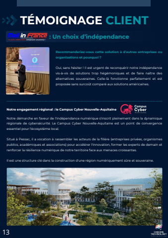 T%u00c9MOIGNAGE CLIENTRecommanderiez-vous cette solution %u00e0 d'autres entreprises ouorganisations et pourquoi ?Oui, sans h%u00e9siter ! Il est urgent de reconqu%u00e9rir notre ind%u00e9pendancevis-%u00e0-vis de solutions trop h%u00e9g%u00e9moniques et de faire na%u00eetre desalternatives souveraines. Celle-l%u00e0 fonctionne parfaitement et estpropos%u00e9e sans surco%u00fbt compar%u00e9 aux solutions am%u00e9ricaines.13: Un choix d%u2019ind%u00e9pendanceNotre d%u00e9marche en faveur de l'ind%u00e9pendance num%u00e9rique s'inscrit pleinement dans la dynamiquer%u00e9gionale de cybers%u00e9curit%u00e9. Le Campus Cyber Nouvelle-Aquitaine est un point de convergenceessentiel pour l'%u00e9cosyst%u00e8me local.Situ%u00e9 %u00e0 Pessac, il a vocation %u00e0 rassembler les acteurs de la fili%u00e8re (entreprises priv%u00e9es, organismespublics, acad%u00e9miques et associations) pour acc%u00e9l%u00e9rer l'innovation, former les experts de demain etrenforcer la r%u00e9silience num%u00e9rique de notre territoire face aux menaces croissantes.Il est une structure cl%u00e9 dans la construction d'une r%u00e9gion num%u00e9riquement s%u00fbre et souveraine.Notre engagement r%u00e9gional : le Campus Cyber Nouvelle-Aquitaine