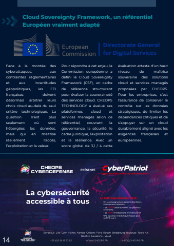 Pour r%u00e9pondre %u00e0 cet enjeu, laCommission europ%u00e9enne ad%u00e9fini le Cloud SovereigntyFramework (CSF), un cadrede r%u00e9f%u00e9rence structurantpour %u00e9valuer la souverainet%u00e9des services cloud. CHEOPSTECHNOLOGY a %u00e9valu%u00e9 sesplateformes cloud etservices manag%u00e9s selon cer%u00e9f%u00e9rentiel, couvrant lagouvernance, la s%u00e9curit%u00e9, lecadre juridique, l%u2019exploitationet la r%u00e9silience. Avec unscore global de 3,1 / 4 cette%u00e9vFace %u00e0 la mont%u00e9e descyberattaques, auxcontraintes r%u00e9glementaireset aux incertitudesg%u00e9opolitiques, les ETIfran%u00e7aises doiventd%u00e9sormais arbitrer leurschoix cloud au-del%u00e0 du seulcrit%u00e8re technologique. Laquestion n%u2019est plusseulement o%u00f9 sonth%u00e9berg%u00e9es les donn%u00e9es,mais qui en ma%u00eetriser%u00e9ellement l%u2019acc%u00e8s,l%u2019exploitation et la valeur.%u00e9valuation atteste d%u2019un hautniveau de ma%u00eetrisesouveraine des solutionscloud et services manag%u00e9spropos%u00e9es par CHEOPS.Pour les entreprises, c%u2019estl%u2019assurance de conserver lecontr%u00f4le sur les donn%u00e9esstrat%u00e9giques, de limiter lesd%u00e9pendances critiques et des%u2019appuyer sur un clouddurablement align%u00e9 avec lesexigences fran%u00e7aises eteurop%u00e9ennes.14Cloud Sovereignty Framework, un r%u00e9f%u00e9rentielEurop%u00e9en vraiment adapt%u00e9Directorate Generalfor Digital Services