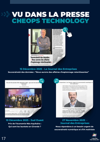 VU DANS LA PRESSECHEOPS TECHNOLOGY27 Novembre 2025 -Journal des EntreprisesNous r%u00e9pondons %u00e0 un besoin urgent desouverainet%u00e9 num%u00e9rique et d%u2019IA ma%u00eetris%u00e9e10 D%u00e9cembre 2025 - Sud OuestPrix de l%u2019%u00e9conomie N%u00e9o Aquitains :Qui sont les laur%u00e9ats en Gironde ?1715 D%u00e9cembre 2025 - Le Journal des EntreprisesSouverainet%u00e9 des donn%u00e9es : %u201cNous aurons des affaires d%u2019espionnage retentissantes%u201d