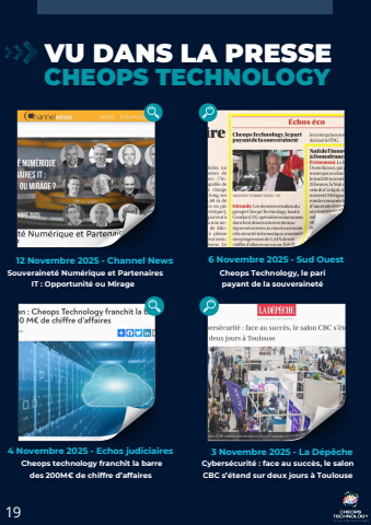 VU DANS LA PRESSECHEOPS TECHNOLOGY3 Novembre 2025 - La D%u00e9p%u00eacheCybers%u00e9curit%u00e9 : face au succ%u00e8s, le salonCBC s%u2019%u00e9tend sur deux jours %u00e0 Toulouse4 Novembre 2025 - Echos judiciairesCheops technology franchit la barredes 200M%u20ac de chiffre d%u2019affaires196 Novembre 2025 - Sud OuestCheops Technology, le paripayant de la souverainet%u00e912 Novembre 2025 - Channel NewsSouverainet%u00e9 Num%u00e9rique et PartenairesIT : Opportunit%u00e9 ou Mirage
