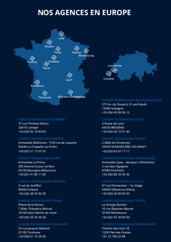LilleRouenParisOrl%u00e9ansToursNantesBordeauxToulouseLyonNancyStrasbourgCHEOPS TECHNOLOGY CAN%u00c9JAN37 rue Thomas Edison33610 Can%u00e9jan+33 (0)5 56 18 83 83CHEOPS TECHNOLOGY NANTESImmeuble Baltimore - 10 B rue de Laponie44240 La Chapelle sur Erdre+33 (0)2 51 13 23 33CHEOPS TECHNOLOGY LILLE97 rue Parmentier - 1er %u00e9tage59650 Villeneuve d%u2019Ascq+33 (0)3 20 89 50 00CHEOPS TECHNOLOGY LYON3 Route de Lyon69530 BRIGNAIS+33 (0)4 26 72 91 40CHEOPS TECHNOLOGY NANCY2 All%u00e9e de Vincennes54500 VANDOEUVRE LES NANCY+33 (0)3 83 97 17 17CHEOPS TECHNOLOGY STRASBOURGImmeuble Spex - A%u00e9roparc d%u2019Entzheim3 rue des Cigognes67960 Entzheim+33 (0)3 88 33 33 36CHEOPS TECHNOLOGY ORL%u00c9ANS3 rue du Greffoir45000 Orl%u00e9ans+33 (0)2 38 55 92 20CHEOPS TECHNOLOGY PARISImmeuble Le Prime305 Avenue le jour se l%u00e8ve92100 Boulogne Billancourt+33 (0)1 41 86 11 00CHEOPS TECHNOLOGY ROUENPlaine de la Ronce7 All%u00e9e Th%u00e9odore Monod76160 Saint Martin du Vivier+33 (0)2 35 59 34 34CHEOPS TECHNOLOGY TOURSLa Grange Barbier10 rue Baptiste Marcet37250 Montbazon+33 (0)2 47 26 00 00CHEOPS TECHNOLOGY TOULOUSE52 rue Jacques Babinet31100 Toulouse+33 (0)5 61 16 26 00CHEOPS TECHNOLOGY AIX EN PROVENCE275 Av. du Douard, ZI Les Paluds13400 Aubagne+33 (0)4 42 84 36 12LausanneGen%u00e8veNOS AGENCES EN EUROPEAix-en-ProvenceCHEOPS TECHNOLOGY SWITZERLANDChemin des Aulx 181228 Plan-les-Ouates+41 22 706 22 88