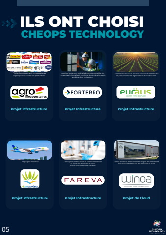 Projet InfrastructureILS ONT CHOISICHEOPS TECHNOLOGY05Filiale du groupement mousquetairesregroupant 56 unit%u00e9s de production.Logiciels hautement sp%u00e9cialis%u00e9s con%u00e7us pour aider lesentreprises industrielles %u00e0 renforcer leurs op%u00e9rations et %u00e0acc%u00e9l%u00e9rer leur croissance.La coop%u00e9rative Euralis innove, valorise et transformeles productions des agriculteurs du Sud-Ouest.Compagnie a%u00e9rienne. Conception, fabrication et conditionnementde produits de toute marque(beaut%u00e9, pharmaceutique, m%u00e9nager..)Leader mondial dans les technologies de traitementde surface et fabricant de grenailles d%u2019acierProjet Infrastructure Projet Infrastructure Projet de CloudProjet InfrastructureProjet Infrastructure