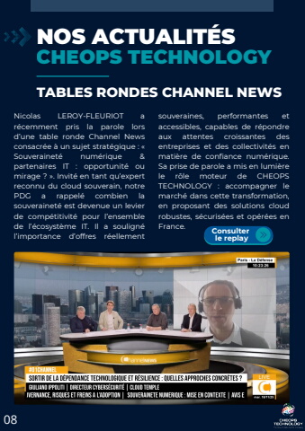 Nicolas LEROY-FLEURIOT ar%u00e9cemment pris la parole lorsd%u2019une table ronde Channel Newsconsacr%u00e9e %u00e0 un sujet strat%u00e9gique : %u00abSouverainet%u00e9 num%u00e9rique &partenaires IT : opportunit%u00e9 oumirage ? %u00bb. Invit%u00e9 en tant qu%u2019expertreconnu du cloud souverain, notrePDG a rappel%u00e9 combien lasouverainet%u00e9 est devenue un levierde comp%u00e9titivit%u00e9 pour l%u2019ensemblede l%u2019%u00e9cosyst%u00e8me IT. Il a soulign%u00e9l%u2019importance d%u2019offres r%u00e9ellementsouNOS ACTUALIT%u00c9SCHEOPS TECHNOLOGYTABLES RONDES CHANNEL NEWS08souveraines, performantes etaccessibles, capables de r%u00e9pondreaux attentes croissantes desentreprises et des collectivit%u00e9s enmati%u00e8re de confiance num%u00e9rique.Sa prise de parole a mis en lumi%u00e8rele r%u00f4le moteur de CHEOPSTECHNOLOGY : accompagner lemarch%u00e9 dans cette transformation,en proposant des solutions cloudrobustes, s%u00e9curis%u00e9es et op%u00e9r%u00e9es enFrance. Consulterle replay