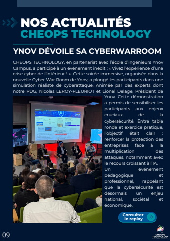 CHEOPS TECHNOLOGY, en partenariat avec l%u2019%u00e9cole d%u2019ing%u00e9nieurs YnovCampus, a particip%u00e9 %u00e0 un %u00e9v%u00e9nement in%u00e9dit : %u00ab Vivez l%u2019exp%u00e9rience d%u2019unecrise cyber de l%u2019int%u00e9rieur ! %u00bb. Cette soir%u00e9e immersive, organis%u00e9e dans lanouvelle Cyber War Room de Ynov, a plong%u00e9 les participants dans unesimulation r%u00e9aliste de cyberattaque. Anim%u00e9e par des experts dontnotre PDG, Nicolas LEROY-FLEURIOT et Lionel Delage, Pr%u00e9sident deYao Ynov. Cette d%u00e9monstrationa permis de sensibiliser lesparticipants aux enjeuxcruciaux de lacybers%u00e9curit%u00e9. Entre tableronde et exercice pratique,l%u2019objectif %u00e9tait clair :renforcer la protection desentreprises face %u00e0 lamultiplication desattaques, notamment avecle recours croissant %u00e0 l%u2019IA.Un %u00e9v%u00e9nementp%u00e9dagogique etprofessionnel, rappelantque la cybers%u00e9curit%u00e9 estd%u00e9sormais un enjeunational, soci%u00e9tal et%u00e9conomique.09NOS ACTUALIT%u00c9SCHEOPS TECHNOLOGYYNOV D%u00c9VOILE SA CYBERWARROOMConsulterle replay