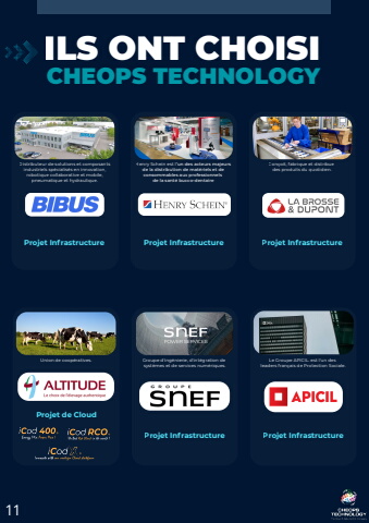 Projet InfrastructureILS ONT CHOISICHEOPS TECHNOLOGY11Distributeur de solutions et composantsindustriels sp%u00e9cialis%u00e9s en innovation,robotique collaborative et mobile,pneumatique et hydraulique.Henry Schein est l%u2019un des acteurs majeursde la distribution de mat%u00e9riels et deconsommables aux professionnelsde la sant%u00e9 bucco-dentaireCon%u00e7oit, fabrique et distribuedes produits du quotidien.Union de coop%u00e9ratives. Groupe d'ing%u00e9nierie, d'int%u00e9gration desyst%u00e8mes et de services num%u00e9riques.Le Groupe APICIL. est l'un desleaders fran%u00e7ais de Protection Sociale.Projet Infrastructure Projet InfrastructureProjet de CloudProjet InfrastructureProjet Infrastructure