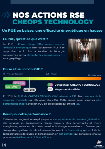 14NOS ACTIONS RSECHEOPS TECHNOLOGYLe PUE, qu%u2019est-ce que c%u2019est ?Le PUE : Power Usage Effectiveness mesurel%u2019efficacit%u00e9 %u00e9nerg%u00e9tique d%u2019un datacenter. Plus il serapproche de 1, plus la totalit%u00e9 de l%u2019%u00e9nergieconsomm%u00e9e sert %u00e0 alimenter les %u00e9quipements IT -sans gaspillage.1,37 - 20211,0 - Tr%u00e8s performant 3,0 - M%u00e9diocre2,0 - Moyen1,35 - 20261,57 - 2021O%u00f9 se situe un bon PUE ?En 2021, le PUE de CHEOPS TECHNOLOGY s%u2019%u00e9levait %u00e0 1,37. Bien au-del%u00e0 de lamoyenne mondiale qui atteignait alors 1,57. Cette ann%u00e9e, nous sommes plusperformants encore, avec un PUE en progression qui atteint 1,35.Pourquoi cette performance ?Cette nette progression s%u2019explique par nos %u00e9quipements de derni%u00e8re g%u00e9n%u00e9ration :des serveurs et %u00e9quipements r%u00e9seau toujours plus performants et moins%u00e9nergivores, r%u00e9duisant la consommation %u00e0 charge %u00e9quivalente. D%u2019autre part,l%u2019usage d%u2019un syst%u00e8me de refroidissement innovant : le free cooling, qui exploite lestemp%u00e9ratures ext%u00e9rieures, et l%u2019organisation en hot corridor qui canalise la chaleurpour un refroidissement cibl%u00e9 et efficace.Un PUE en baisse, une efficacit%u00e9 %u00e9nerg%u00e9tique en hausseDatacenter CHEOPS TECHNOLOGYMoyenne Mondiale