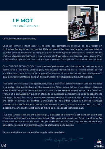 Chers clients, chers partenaires,Dans un contexte in%u00e9dit pour l%u2019IT, la crise des composants continue de bouleverser enprofondeur les %u00e9quilibres du march%u00e9. D%u00e9lais impr%u00e9visibles, hausses de prix monumentales etbrutales pour les m%u00e9moires, les disques SSD et certains types de processeurs, tensions sur lescha%u00eenes d%u2019approvisionnement : vos projets d%u2019infrastructure on-premise sont aujourd%u2019huidirectement impact%u00e9s. Cette situation impose %u00e0 chacun de repenser ses mod%u00e8les avec lucidit%u00e9.Chez CHEOPS TECHNOLOGY, nous sommes pleinement mobilis%u00e9s pour accompagner nosclients face %u00e0 ces d%u00e9fis. Chaque jour, nos %u00e9quipes travaillent sur la rationalisation de vosinfrastructures pour s%u00e9curiser les approvisionnements, et vous conseillent avec transparencepour d%u00e9fendre vos int%u00e9r%u00eats dans un environnement devenu particuli%u00e8rement instable.Mais cette crise est aussi une opportunit%u00e9, celle d%u2019acc%u00e9l%u00e9rer la transformation vers des mod%u00e8lesplus agiles, plus pr%u00e9dictibles et plus souverains. Nous avons fait ce choix depuis plusieursann%u00e9es en d%u00e9veloppant massivement nos offres Cloud, op%u00e9r%u00e9es depuis nos 5 Datacenters enFrance, et 3 en Suisse. En ayant en stock de la puissance de traitement et de la capacit%u00e9 destockage disponibles, nous sommes ainsi en mesure de vous garantir des prix sur trois %u00e0 cinqans selon le niveau de contrat. L%u2019ensemble de nos offres Cloud & Services Manag%u00e9spersonnalis%u00e9es en fonction de votre environnement vous garantissent ainsi une tr%u00e8s hautedisponibilit%u00e9, une maitrise des co%u00fbts et moins de d%u00e9pendance technologique.Plus que jamais, il est essentiel d%u2019anticiper, d%u2019adapter et d%u2019innover. C%u2019est dans cet esprit quenous poursuivons notre engagement %u00e0 vos c%u00f4t%u00e9s, avec une conviction forte : transformer lescontraintes d%u2019aujourd%u2019hui en leviers de performance durable, avec un PUE de 1,35 dans nosDatacenters, et une %u00e9nergie 100% verte, cela fait partie de l%u2019%u00e9quation.Je vous souhaite une excellente lecture de cette newsletter,DU PR%u00c9SIDENTLE MOT03