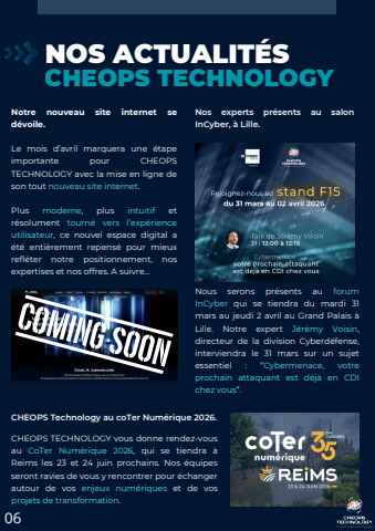 Notre nouveau site internet sed%u00e9voile.Le mois d%u2019avril marquera une %u00e9tapeimportante pour CHEOPSTECHNOLOGY avec la mise en ligne deson tout nouveau site internet.Plus moderne, plus intuitif etr%u00e9solument tourn%u00e9 vers l%u2019exp%u00e9rienceutilisateur, ce nouvel espace digital a%u00e9t%u00e9 enti%u00e8rement repens%u00e9 pour mieuxrefl%u00e9ter notre positionnement, nosexpertises et nos offres. A suivre...06NOS ACTUALIT%u00c9SCHEOPS TECHNOLOGYNous serons pr%u00e9sents au forumInCyber qui se tiendra du mardi 31mars au jeudi 2 avril au Grand Palais %u00e0Lille. Notre expert J%u00e9r%u00e9my Voisin,directeur de la division Cyberd%u00e9fense,interviendra le 31 mars sur un sujetessentiel : %u201cCybermenace, votreprochain attaquant est d%u00e9j%u00e0 en CDIchez vous%u201d.Nos experts pr%u00e9sents au salonInCyber, %u00e0 Lille.CHEOPS Technology au coTer Num%u00e9rique 2026.CHEOPS TECHNOLOGY vous donne rendez-vousau CoTer Num%u00e9rique 2026, qui se tiendra %u00e0Reims les 23 et 24 juin prochains. Nos %u00e9quipesseront ravies de vous y rencontrer pour %u00e9changerautour de vos enjeux num%u00e9riques et de vosprojets de transformation.