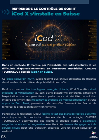 Dans un contexte IT marqu%u00e9 par l%u2019instabilit%u00e9 des infrastructures et lesdifficult%u00e9s d%u2019approvisionnement en ressources mat%u00e9rielles, CHEOPSTECHNOLOGY d%u00e9ploie iCod X en Suisse.Ce cloud souverain 100 % suisse r%u00e9pond aux enjeux croissants de ma%u00eetrisedes donn%u00e9es, de s%u00e9curit%u00e9 et de pr%u00e9visibilit%u00e9 des co%u00fbts.Bas%u00e9 sur une architecture hyperconverg%u00e9e Nutanix, iCod X unifie calcul,stockage et virtualisation au sein d%u2019une plateforme coh%u00e9rente, simplifiantl%u2019exploitation tout en garantissant performance et stabilit%u00e9. La solutionint%u00e8gre %u00e9galement des m%u00e9canismes avanc%u00e9s de microsegmentation et uneapproche Zero Trust, permettant de contr%u00f4ler finement les flux et derenforcer la protection des environnements.Pens%u00e9 pour la r%u00e9silience, iCod X facilite le test des plans de reprise d%u2019activit%u00e9,sans impacter la production. Au-del%u00e0 de la technologie, CHEOPSTECHNOLOGY accompagne ses clients %u00e0 chaque %u00e9tape : diagnostic,migration one shot ou progressive associ%u00e9e %u00e0 des niveaux d%u2019engagement deservice %u00e9lev%u00e9s pour une transition s%u00e9curis%u00e9e vers un cloud souverain etma%u00eetris%u00e9.REPRENDRE LE CONTR%u00d4LE DE SON ITiCod X s%u2019installe en Suisse08